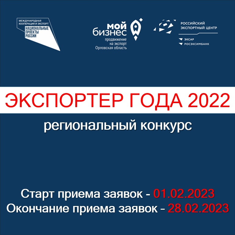 В рамках реализации национального проекта «Международная кооперация и экспорт» Орловский региональный Центр поддержки экспорта проводит 5 юбилейный региональный Конкурс «Экспортер года 2022» среди субъектов малого и среднего предпринимательства Орловской области.
