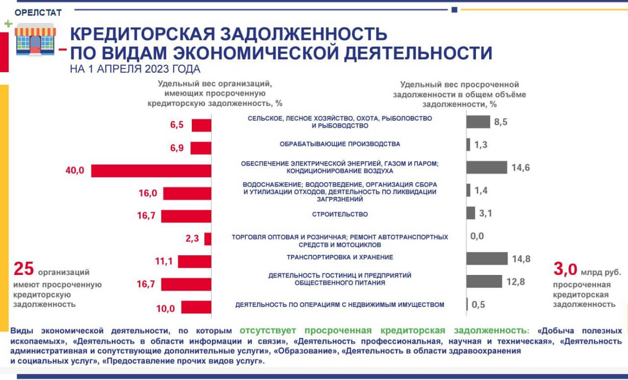 Если смотреть в разрезе отраслей, то хуже всего обстоят дела в сфере «Обеспечение электрической энергией, газом и паром: кондиционирование воздуха». По данным Орелстата, просроченную кредиторскую задолженность имеют 40 процентов предприятий указанной сферы. Также проблемы со своевременным погашением долгов имеют 16,7 процента предприятий общественного питания, гостиниц и строительных организаций, 16 процентов предприятий сферы водоснабжения, 11,1 процента логистических организаций.