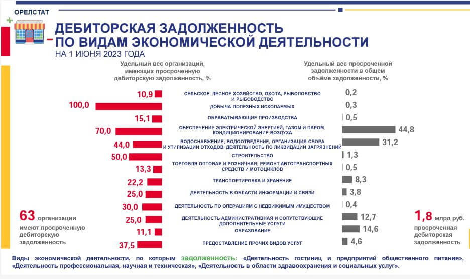«На конец мая 2023 года кредиторская задолженность составила 84,779 миллиарда рублей, или 100,5 процента к аналогичной дате 2022 года, — говорится в информации Орелстата. — Из нее просроченная составляет 2,764 миллиарда рублей, или 3,3 процента от общей суммы кредиторской задолженности. Дебиторская задолженность сложилась в сумме 84,641 миллиарда рублей, или 98 процентов к аналогичной дате 2022 года, из нее просроченная – 1,75 миллиарда рублей, или 2,1 процента от общего объема дебиторской задолженности».