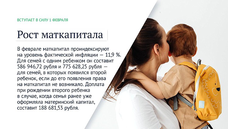 В феврале материнский капитал будет проиндексирован на 11,9% и составит 587 тыс. рублей на первого ребёнка и 775,6 тыс. рублей – на второго.