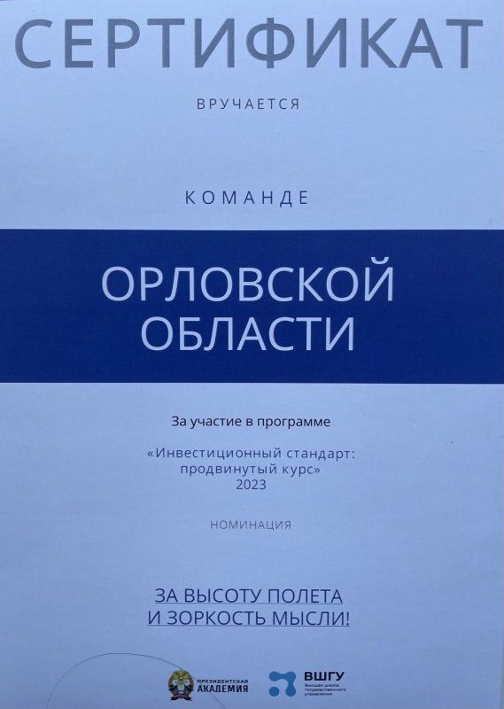 Инвестиционная команда Орловской области завершила обучение по программе «Региональный инвестиционный стандарт: продвинутый курс». Все члены команды получили подтверждающие удостоверения.