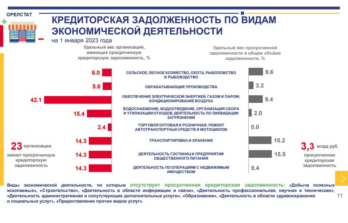 Подсчитано также, что просроченные финансовые обязательства перед кредиторами на начало 2023 года в Орловской области имели всего 23 организации, подпадающие под статистическое наблюдение. Но тут обращает на себя внимание тот факт, что просроченную задолженность имели более 40 процентов предприятий сферы обеспечения электрической энергией, газом и паром, то есть поставщики коммунальных ресурсов. При этом на них приходится всего 9,4 процента общей просроченной задолженности орловского бизнеса.