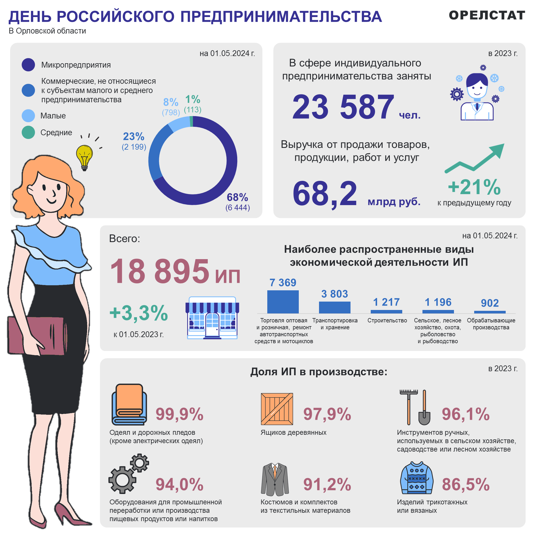 В Орловской области в сфере индивидуального предпринимательства заняты 23 587 человек. Наиболее распространённый вид деятельности – торговля и ремонт автотранспорта. Подробнее о деятельности региональных предприниматтелей можно узнать из таблицы, предоставленной Орёлстатом.