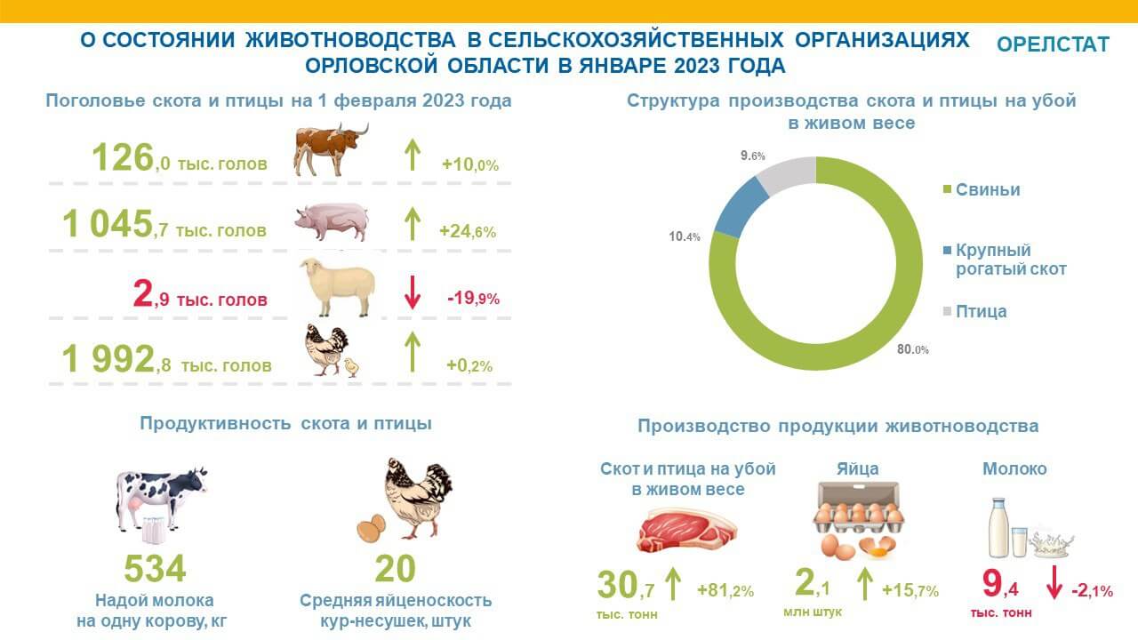 «Объемы производства мяса (в живом весе) выросли по сравнению с январем прошлого года по следующим видам скота: крупного рогатого скота — на 112,7 процента, свиней – на 93,6 процента, овец – на 145,5 процента, птицы – на 6,7 процента», — уточнили в Орелстате. Также в регионе было произведено 9,4 тысячи тонн молока (97,9 процента к уровню января 2022 года) и 2,1 миллиона яиц (115,7 процента).