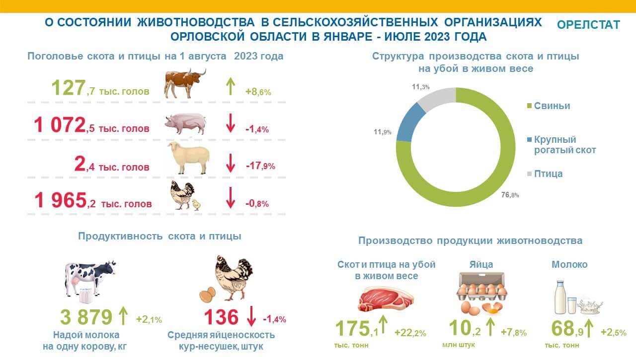 Как сообщает Орелстат, в Орловской области по состоянию на 1 августа 2023 года стадо крупного рогатого скота сельскохозяйственных организаций насчитывало 127,7 тысячи голов, или 108,6 процента к уровню на 1 августа 2022 года. В том числе коров в регионе насчитывается 33,9 тысячи голов, что на 0,6 процента меньше, чем годом ранее. Несмотря на сокращение численности коров в Орловской области в этом году произвели 68,9 тысячи тонн молока, что на 2,5 процента больше, чем было год назад на такую же дату.