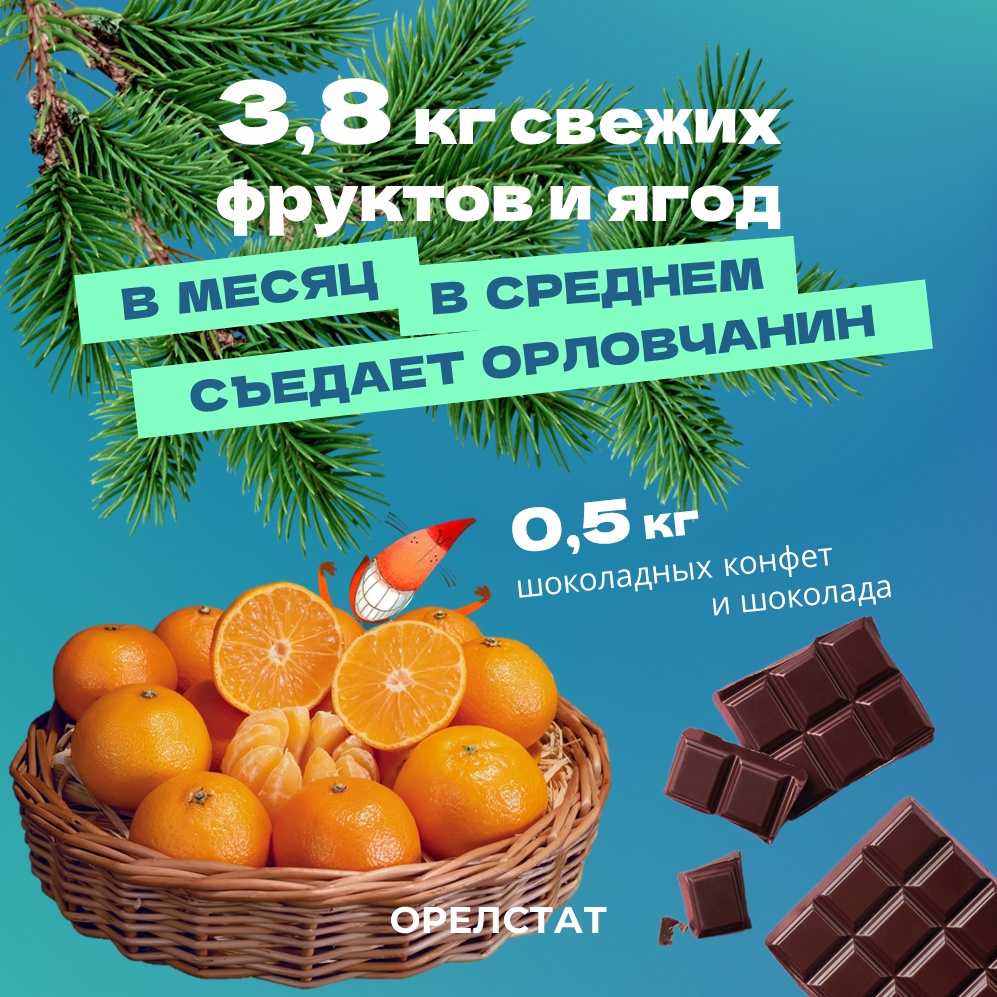 По данным Орелстата, в месяц орловец съедает около 3,8 килограмма свежих фруктов и ягод, полкилограмма шоколадных конфет и шоколада. В 2023 году в Орловской области было реализовано кондитерских изделий на сумму 8,7 млрд рублей, свежих фруктов — на 3,9 млрд рублей. Доля кондитерских изделий в структуре оборота розничной торговли составила 4,4%, свежих фруктов — 2,1%.