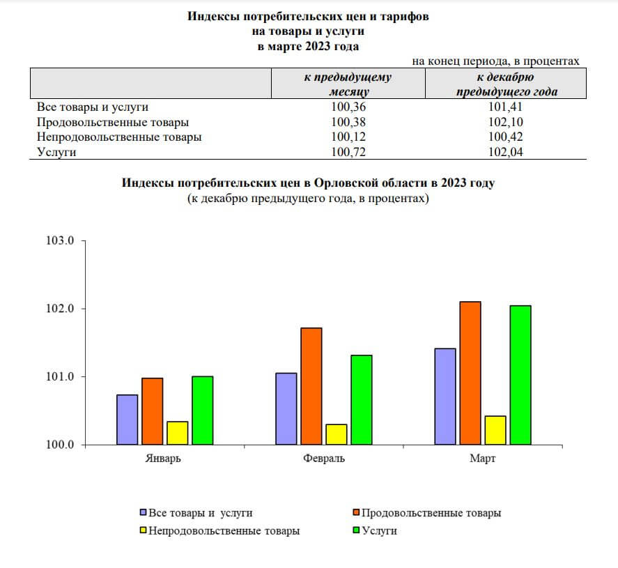В марте 2023 года на потребительском рынке Орловской области цены и тарифы на товары и услуги по сравнению с предыдущим месяцем повысились на 0,4 процента, а с начала года увеличились на 1,4 процента. Такие оперативные данные приводит Орелстат. При этом товары непродовольственной группы подорожали с начала года всего на 0,4 процента. Лидером инфляции являются продукты питания, средний ценник на которые в этом году вырос уже на 2,1 процента. Кроме того, на 2 процента подорожали платные услуги различных категорий, предоставляемые населению.