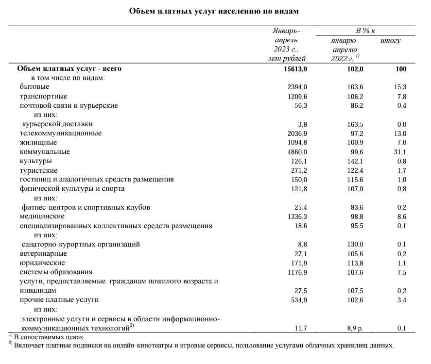 Орелстат оценил текущее состояние рынка платных услуг населению. По его оперативным данным, в январе-апреле 2023 года населению Орловской области в целом было оказано платных услуг на общую сумму 15,613 миллиарда рублей, что в сопоставимых ценах на 2 процента больше, чем было годом ранее. В структуре платных услуг населению две трети объема составляют жилищно-коммунальные, бытовые и телекоммуникационные услуги. Последние растут наиболее динамичными темпами. Так, уже который месяц подряд лидером рейтинга роста объемов предоставления услуг являются электронные услуги и сервисы в области информационно-коммуникационных технологий. Эту сфера включает в себя платные подписки на онлайн-кинотеатры и игровые сервисы, а также пользование услугами облачных хранилищ данных. За отчетный период времени орловцы потратили на данные услуги 11,7 миллиона рублей, что 8,9 раза больше, чем годом ранее.
