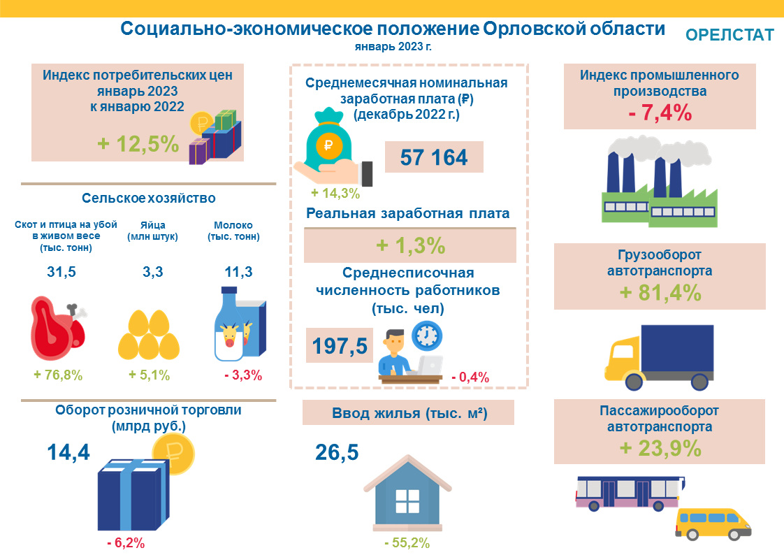 В сельскохозяйственной отрасли региона плюсует производство мяса и яиц, а производство молока отстаёт от уровня предыдущего года. Подробнее о социально-экономическом положении Орловской области в январе 2023 года можно узнать, посмотрев инфографику.