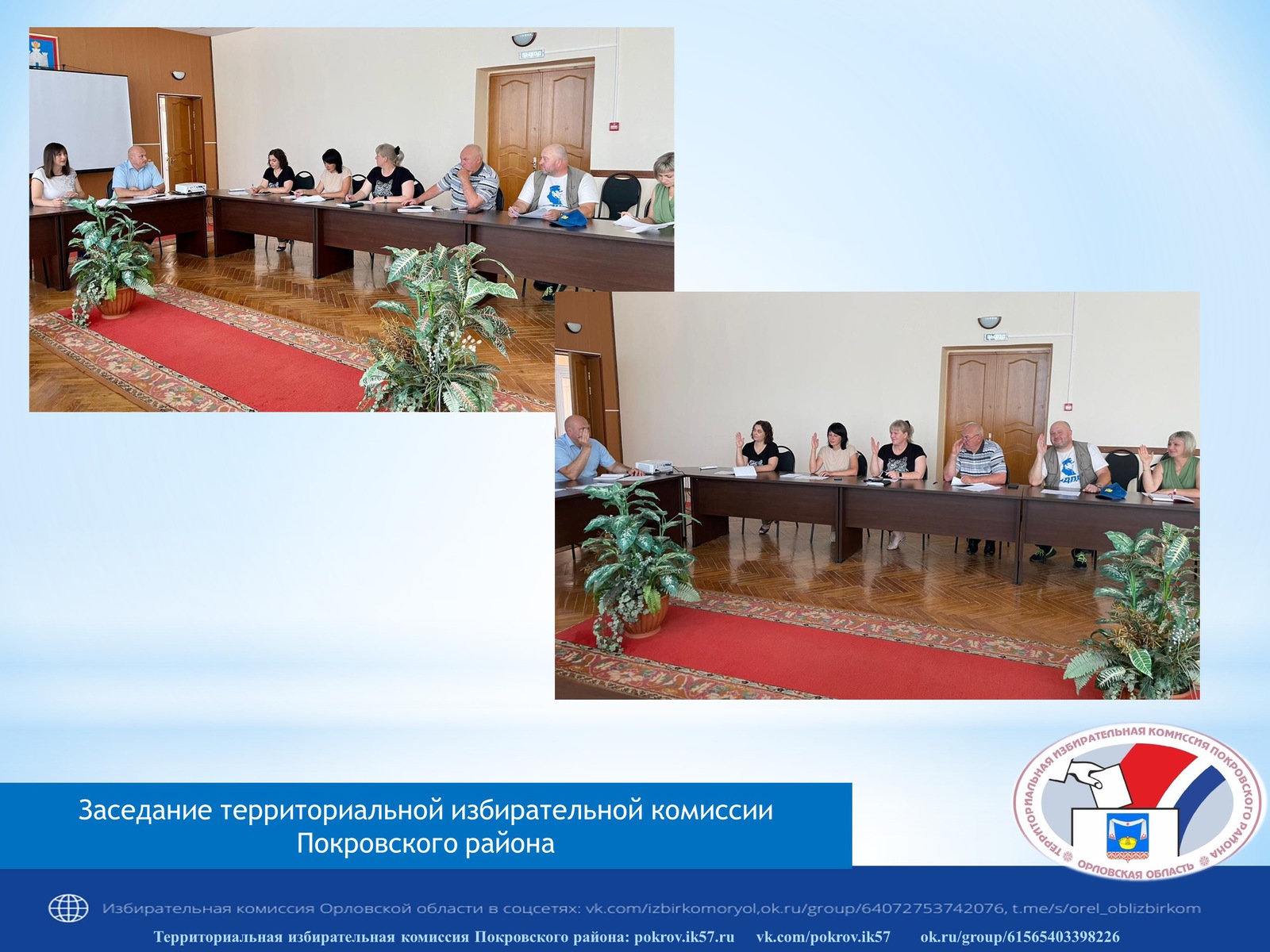 24 июля состоялось 35-е заседание территориальной избирательной комиссии Покровского района на котором был утвержден график дежурств членов комиссии с правом решающего голоса по приему заявлений избирателей по месту нахождения.