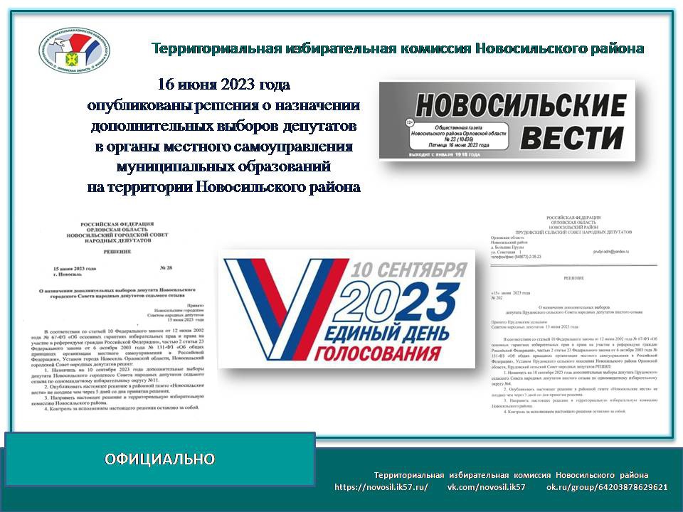 16 июня 2023 года опубликованы решения о назначении дополнительных выборов депутатов в органы местного самоуправления муниципальных образований на территории Новосильского района