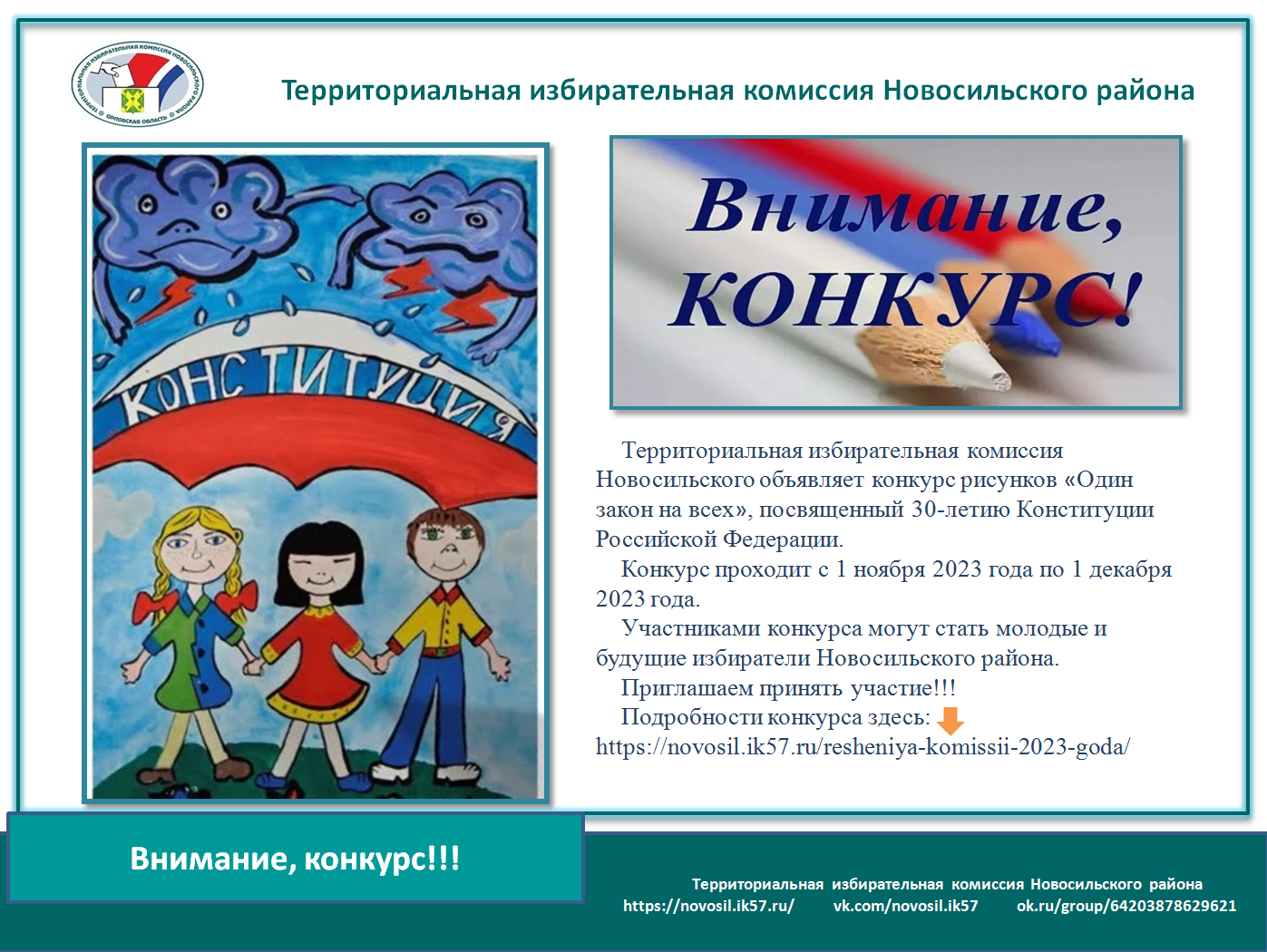 Территориальная избирательная комиссия Новосильского объявляет конкурс рисунков «Один закон на всех», посвященный 30-летию Конституции Российской Федерации.