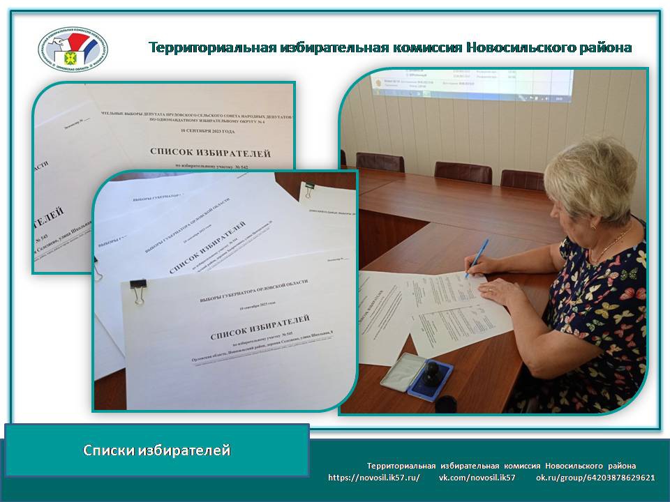 Территориальная избирательная комиссия Новосильского района передала в участковые избирательные комиссии списки избирателей для голосования на выборах Губернатора Орловской области и на дополнительных выборах депутатов в органы местного самоуправления муниципальных образований на территории Новосильского района, назначенных на 10 сентября 2023 года.