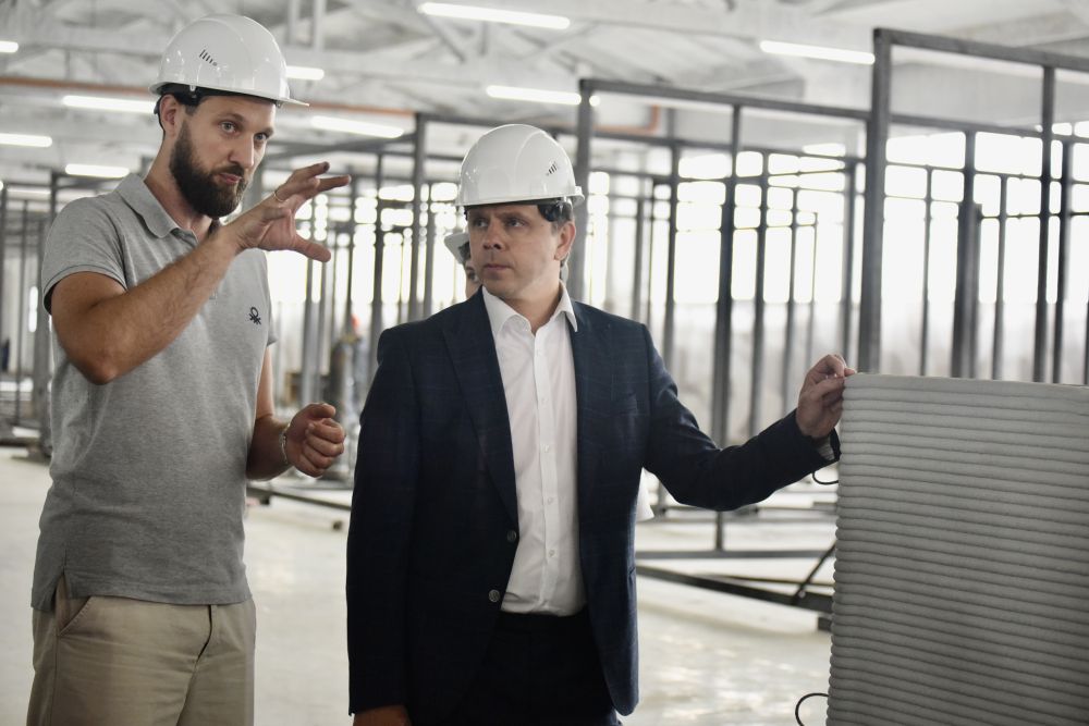 Губернатор посетил уже готовый жилой модуль, построенный с помощью строительного 3D-принтера из легкой пластичной бетонной смеси. Она разработана силами предприятия совместно с Московским строительным университетом с использованием отечественного сырья и комплектующих.