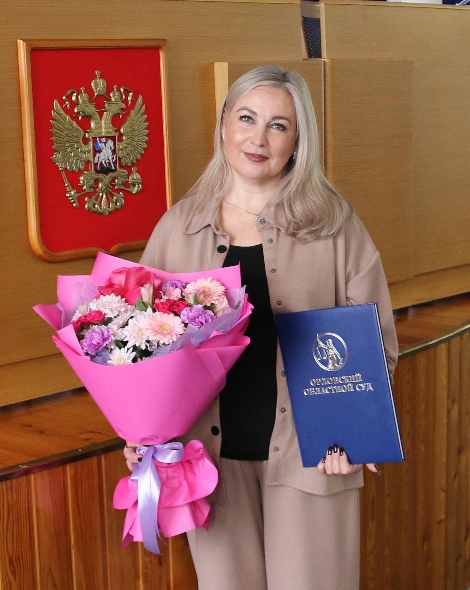 Сегодня председатель Орловского областного суда Е.Н. Суворова тепло поздравила с юбилейным днем рождения ведущего специалиста 3-го разряда отдела делопроизводства и приема граждан С.В. Мусиенко.