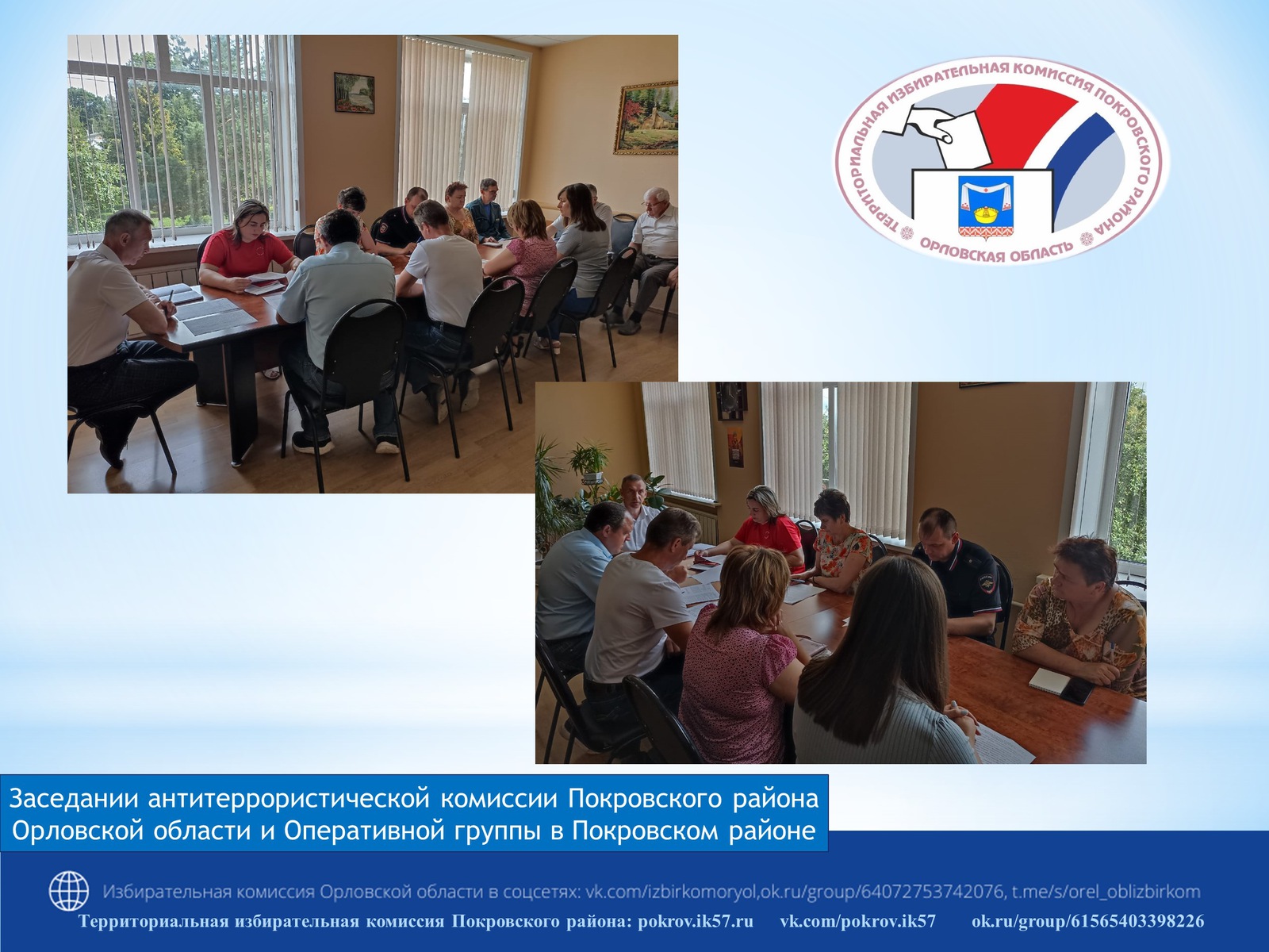 10 июля председатель территориальной избирательной комиссии Покровского района Надежда Воробьева приняла участие в заседании антитеррористической комиссии Покровского района Орловской области и Оперативной группы в Покровском районе.