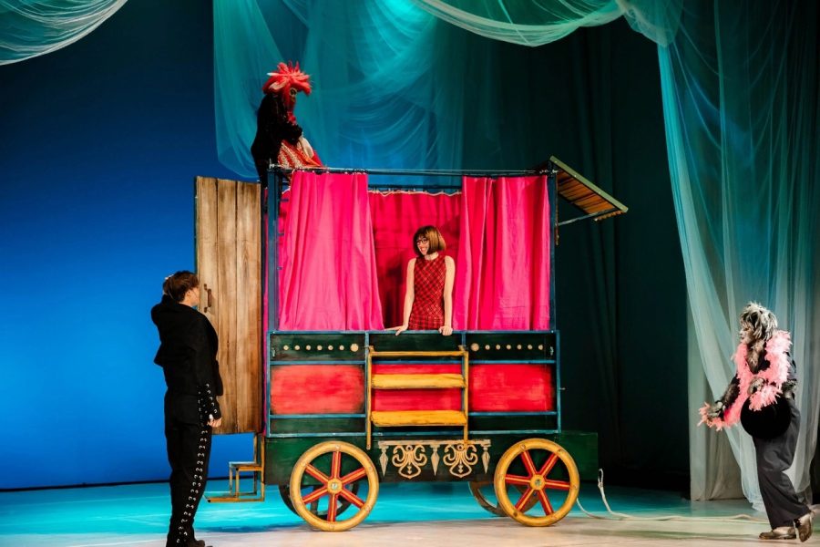 К бесспорным достоинствам постановки следует отнести визуальные решения — костюмы и грим персонажей заслуживают похвалы. Не сразу даже знаток театральной труппы узнает в Петухе Елену Симонову, а в Слоне — Михаила Неженцева. Однако к системе персонажей остались вопросы. Например, банда разбойников (Юлия Григорьева, Валентин Тюрин, Артем Исаков, Валерия Жилина) играет свой спектакль, как и сыщик (Сергей Козлов). Так что это отдельные фрагменты, на наш взгляд, выпадающие из общего заданного контекста. Влюблённая пара — Трубадур и Принцесса (студент ОГИК Данила Маскаеев и артистка Эльвира Узянбаева) — выглядит не очень убедительно: эмоциональное единство героев не считывается, Трубадур не меняется внутренне с приходом любовного озарения, а в образе Принцессы проглядывается намеренная сухость, в то время как ожидаешь, что она будет излучать радость душевного подъёма.