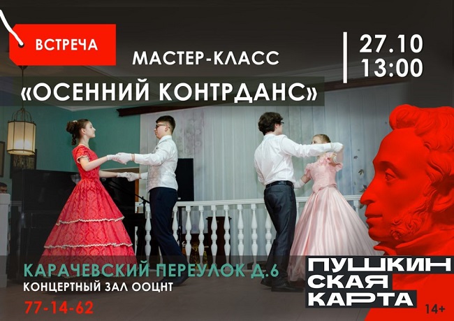 Орловский областной центр народного творчества анонсировал проведение мастер-класса «Осенний контрданс». Мероприятие реализуется в рамках программы «Пушкинская карта», оно пройдет 27 октября в 13:00 в концертном зале Центра. Продолжительность мероприятия составит чуть более часа, однако организаторы обещают гостям довольно интересную программу. Сообщается, например, что на мастер-классе «будут продемонстрированы красота и многообразие исторических танцев, состоится знакомство с лучшими классическими произведениями музыкальной культуры».