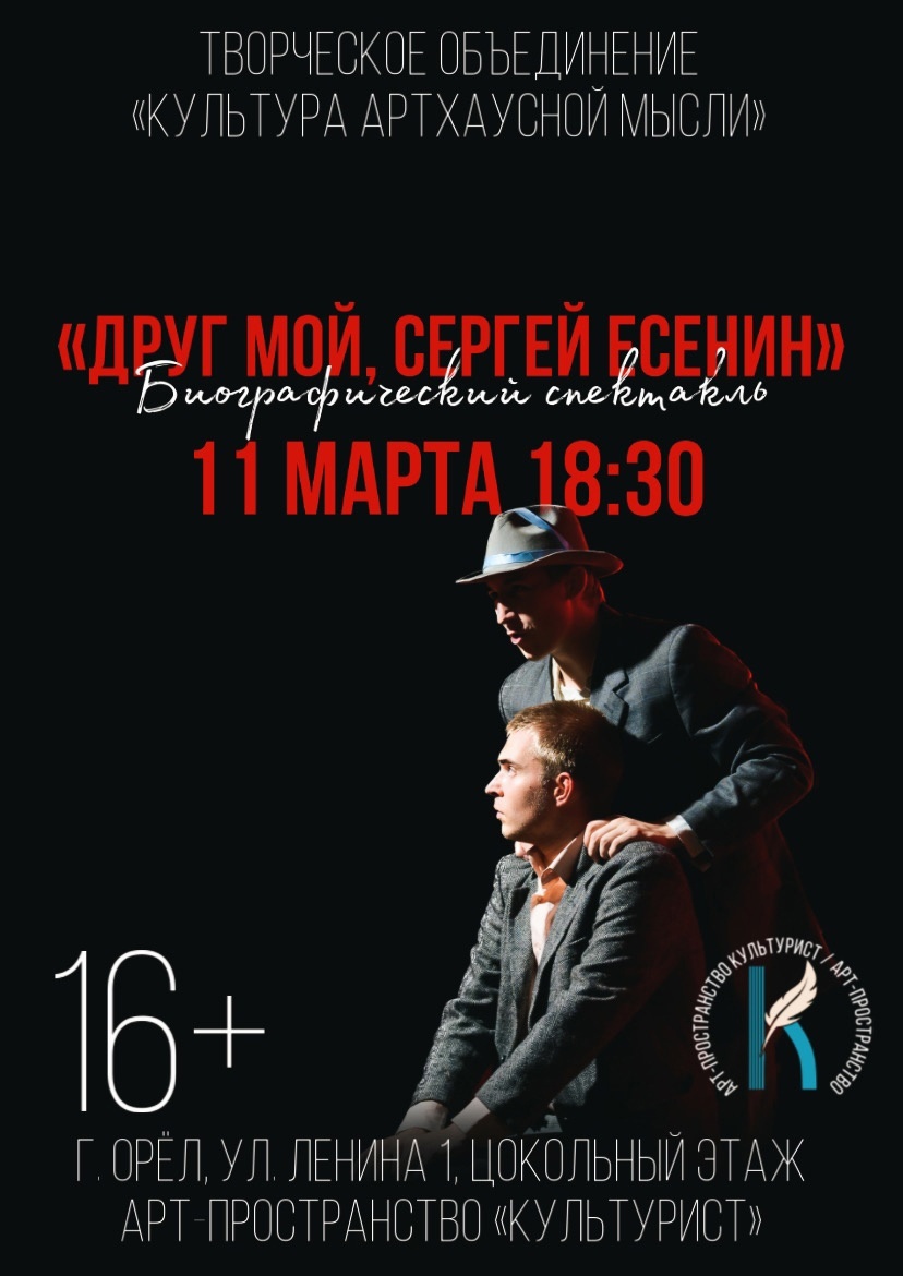 11 марта команда актёров покажет спектакль «Друг мой, Сергей Есенин». Артисты творческого объединения «КАМ» обещают представить Есенина без привычных берёз и золотой ржи, которые традиционно связывают с творчеством поэта. Под нетипичное музыкальное сопровождение прозвучат произведения поэта, которые по-прежнему проникают в самое сердце. Сами артисты говорят, что их творчество – синтез разных видов искусств в театральной оболочке.