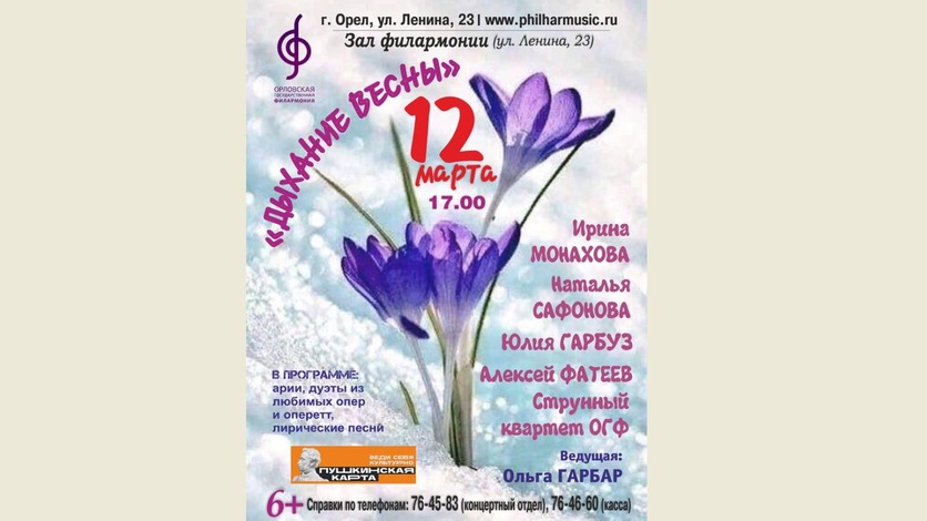 Текущая неделя в Орле завершится концертом "Дыхание весны". Всех желающих на музыкальный вечер приглашает Орловская государственная филармония.