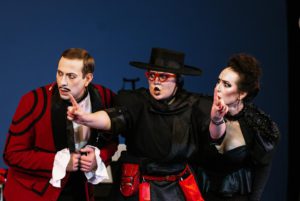 Интересным решением в плане акустического сопровождения спектакля стал выход на сцену музыкантов: шляпы с широкими полями, подкрученные усы, темные одежды – так многие представляют себе горячих испанцев. Саксофон, гитара, перкуссионные инструменты, кахон и даже игрушечная курица – этот ансамбль ласкал слух зрителей на протяжении всего спектакля. Меломаны оценили и интерпретацию мотивов группы White Stripes.