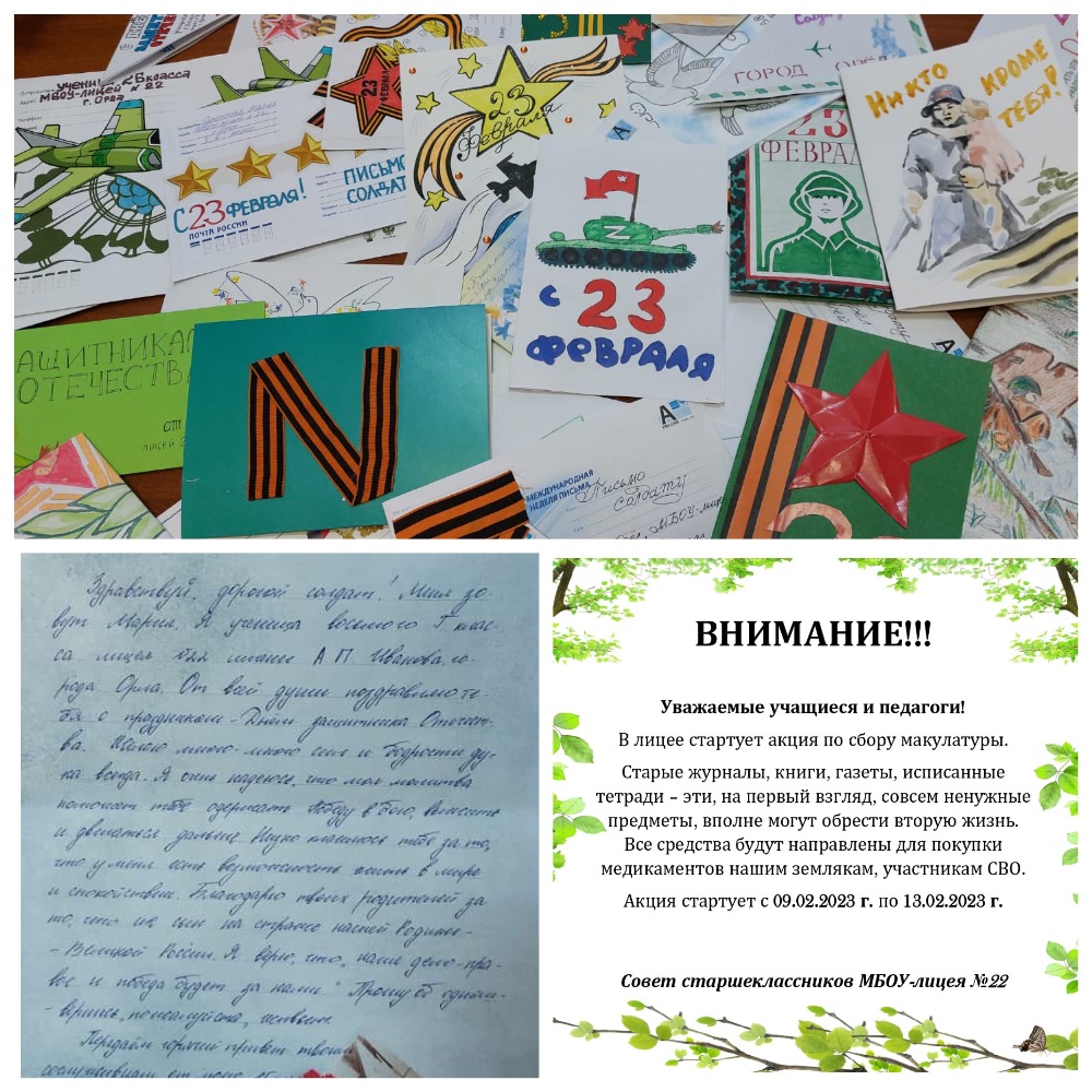 В преддверии 23 февраля учащиеся лицея принимали участие сразу в двух замечательных акциях: "Письмо защитнику Отечества" и акции по сбору макулатуры.