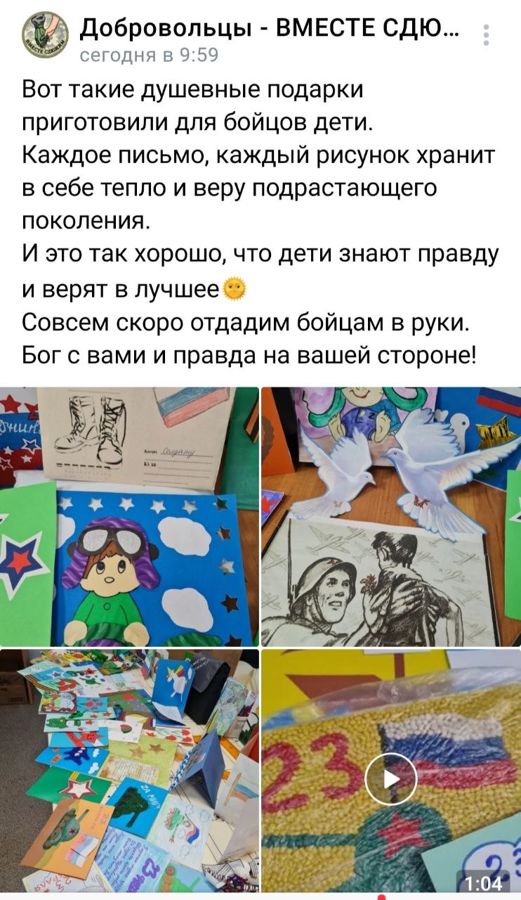 В нашем ДОУ прошла акция #Открытка солдату. Всем приятно получать поздравления, особенно если ты находишься далеко от своей семьи, друзей, своего дома. Открытки созданы для того, чтобы приносить радость и делать обычные дни яркими! Вместе с пожеланием в открытке, которая сделана своими руками, мы отдаем главное - частичку себя, своей души. Много открыток изготовили родители совместно с детьми и воспитатели. Все открытки и письма были переданы в объедение добровольцев "Вместе сдюжим", которая отвезёт их нашим ЗАЩИТНИКАМ.