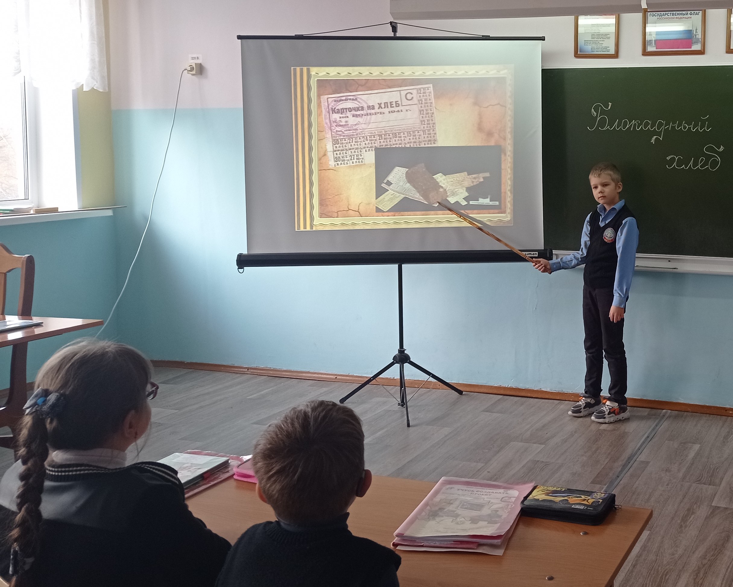 К Всероссийской акции присоединились ученики 2А класса. Вместе с классным руководителем Никаноровой Светланой Николаевной ребята провели час общения "Блокадный хлеб. Рецепт блокадного хлеба". Перед ребятами выступила ученица шестого класса Охоткина Мария с проектом "Хлеб блокадного Ленинграда" о составе блокадного хлеба. Во время коллективной работы второклассники разработали правила отношения к хлебу и приготовили буклет "Рецепты хлеба военного времени".