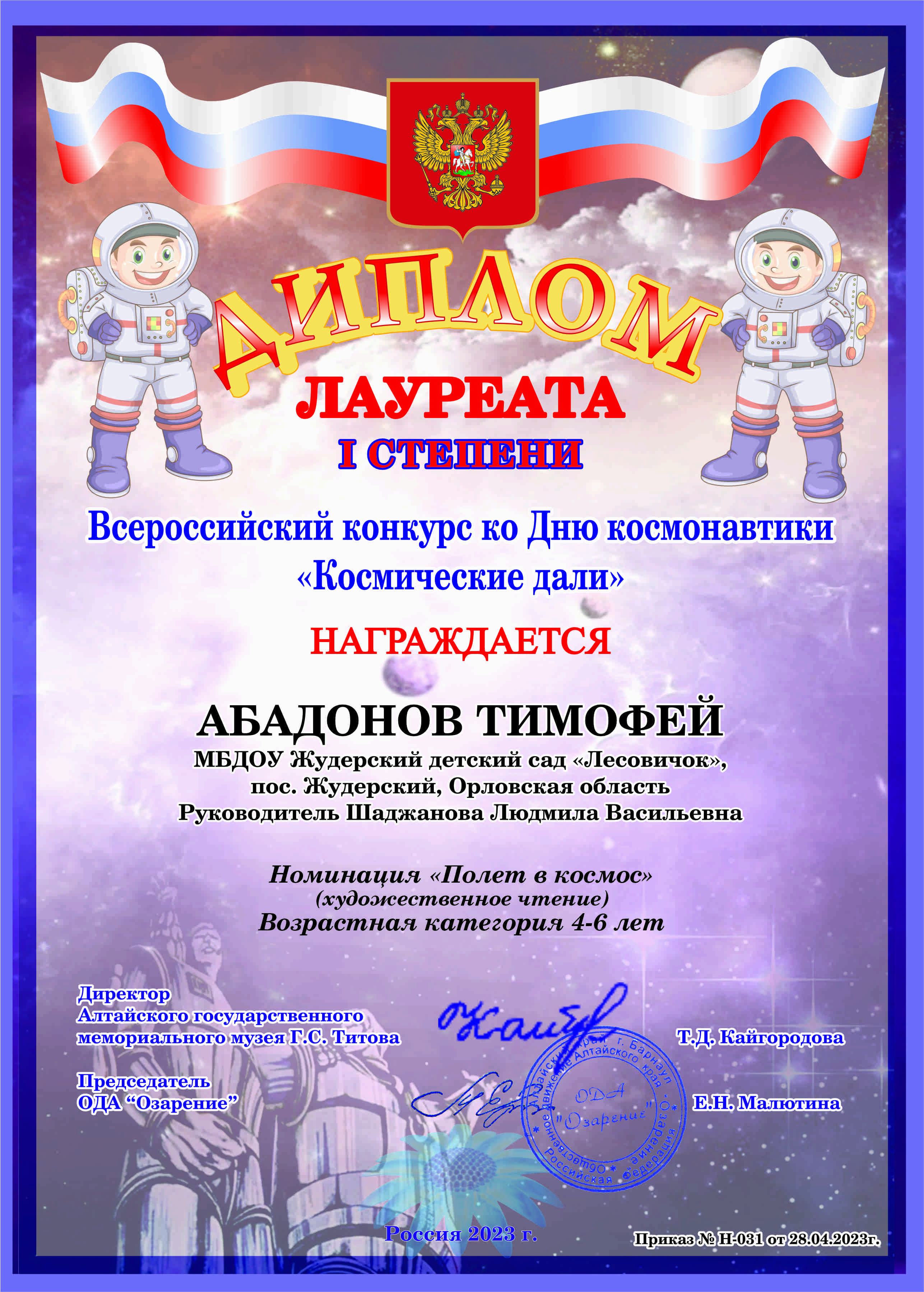 Воспитанники нашего сада приняли участие во Всероссийском конкурсе «Космические дали», который проводился накануне Дня космонавтики при поддержке Алтайского государственного мемориального музея им. Г.С.Титова.