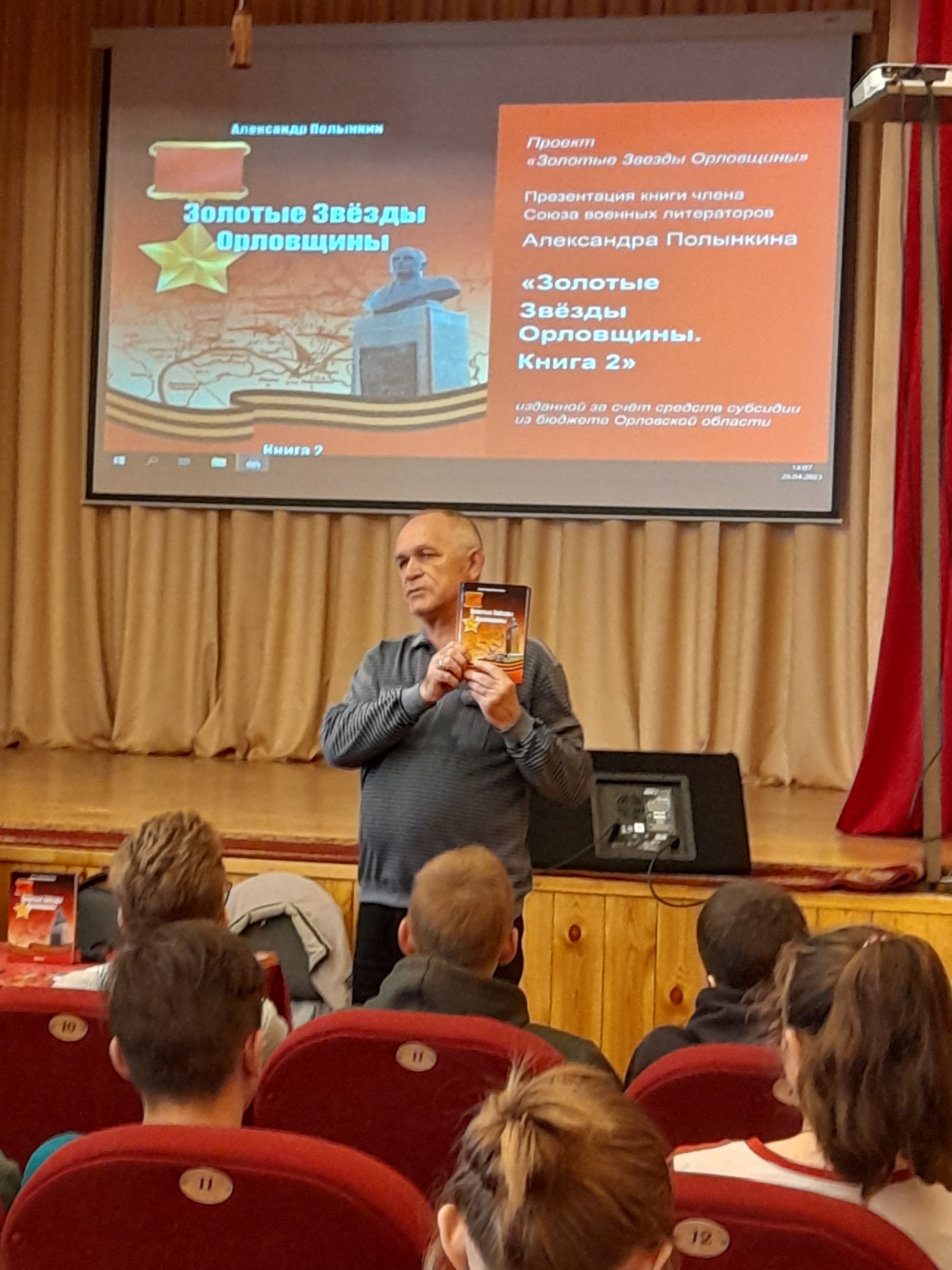26 апреля 2023 года обучающиеся 8 и 10 классов нашей школы приняли участие в презентации книги члена Союза военных литераторов Александра Полынкина «Золотые звѐзды Орловщины.