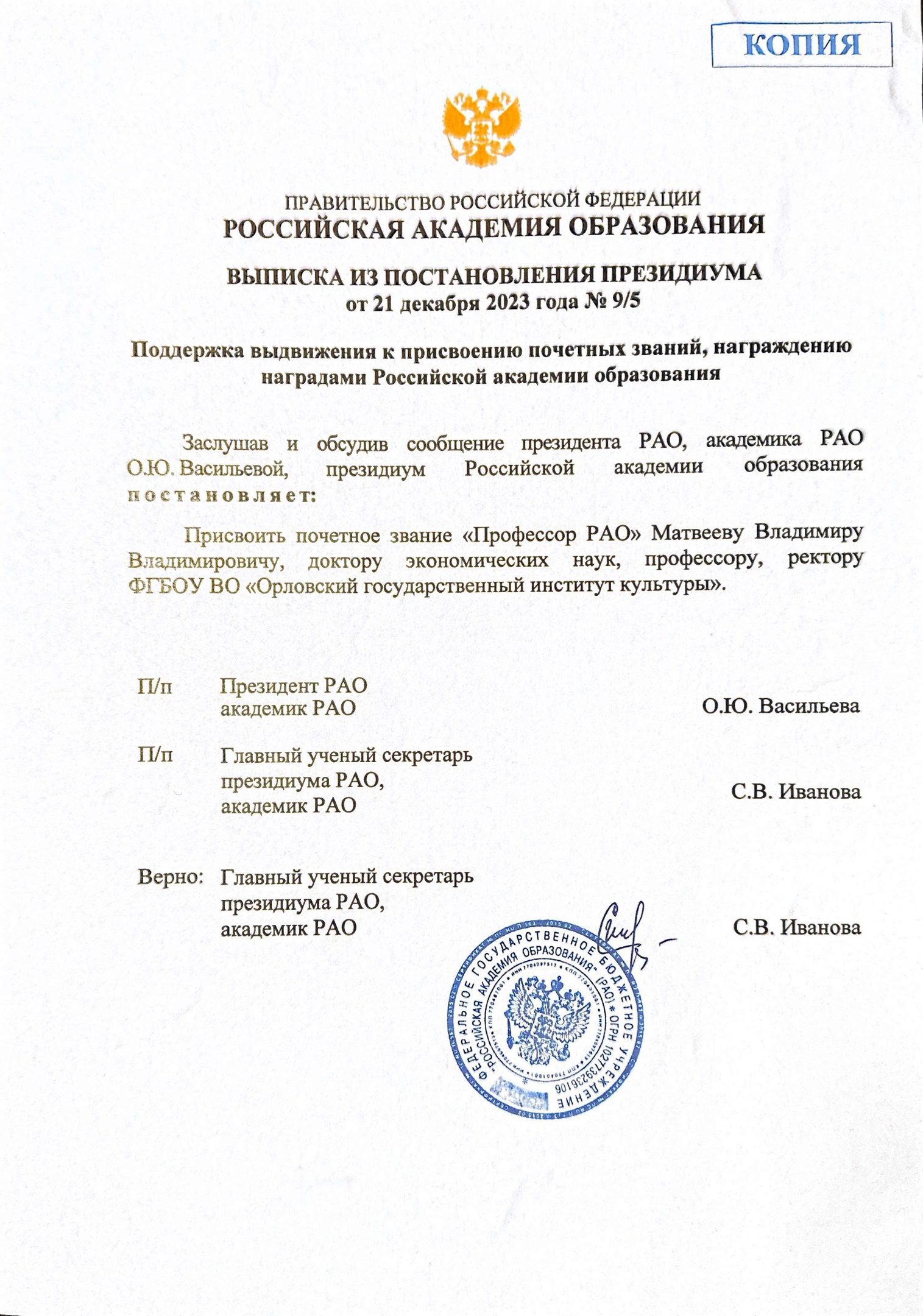 25 января в рамках заседания Президиума Российской академии образования президент РАО академик РАО Ольга Васильева вручила награды академии. Ректор Орловского института культуры доктор экономических наук, профессор Владимир Матвеев получил звание профессора РАО.