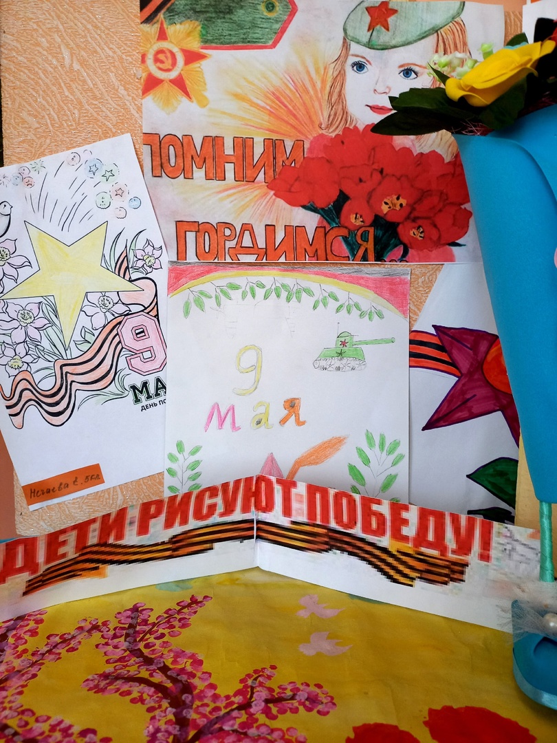 В рамках школьного плана подготовки и проведения Недели мужества, приуроченной к 78-ой годовщине Победы в Великой Отечественной войне, учителем Шапошниковой Т.Н. была организована выставка детских рисунков "Рисуем Победу". В работах обучающихся школы-интерната изображены сцены победной записи на стене Рейхстага, Вечный огонь, радостные моменты Победы, образы участников войны в мирное время, сделаны из бумаги голуби, олицетворяющие во все времена мир и чистое небо над головой. В каждой работе наши дети вложили свои чувства и видения к подвигам военных событий тех времен.