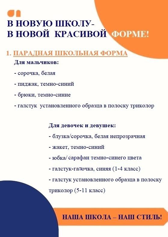 Вместе с тем, на странице МБОУ «Школа №53» Орла ВКонтакте размещены довольно подробные памятки, описывающие комплектацию трёх форм одежды: спортивной, парадной и повседневной. В частности, указывается, что «внешний вид и школьная форма обучающихся должны носить светский характер».