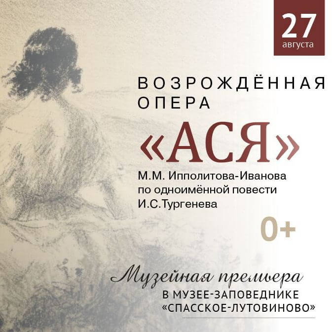 Как сообщили в Государственном мемориальном и природном музее-заповеднике И.С. Тургенева «Спасское-Лутовиново», 27 августа в родовой усадьбе знаменитого писателя состоится музейная премьера оперы Михаила Ипполитова-Иванова «Ася». Она будет поставлена по одноименной повести Ивана Тургенева. Сообщается, что проект возрождения одного из шедевров отечественного оперного искусства реализован силами Государственного музыкально-педагогического института имени М.М. Ипполитова-Иванова и Российской академии театрального искусства – ГИТИС.