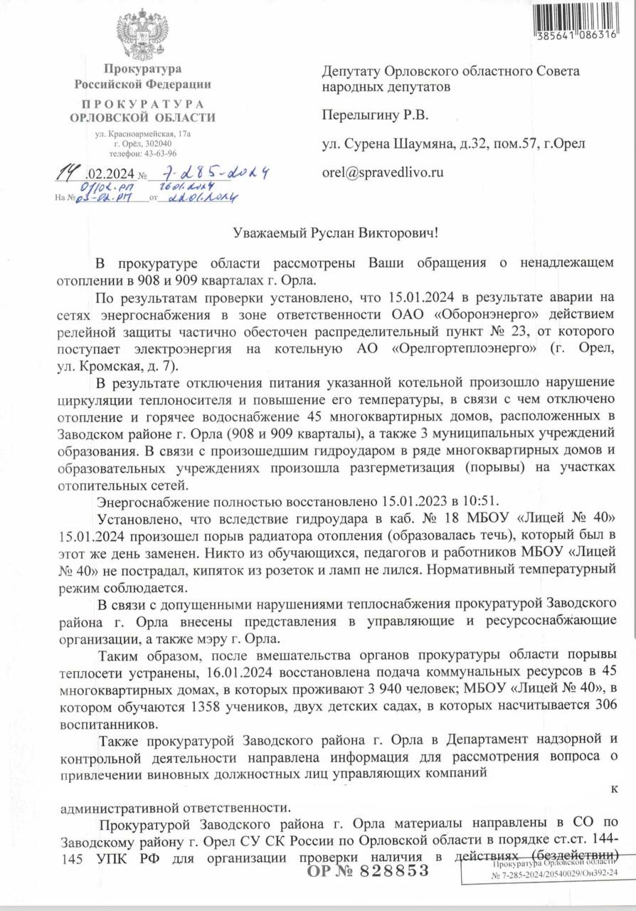 Ответ от областной прокуратуры с такой информацией пришел в адрес депутата Орловского облсовета Руслана Перелыгина.