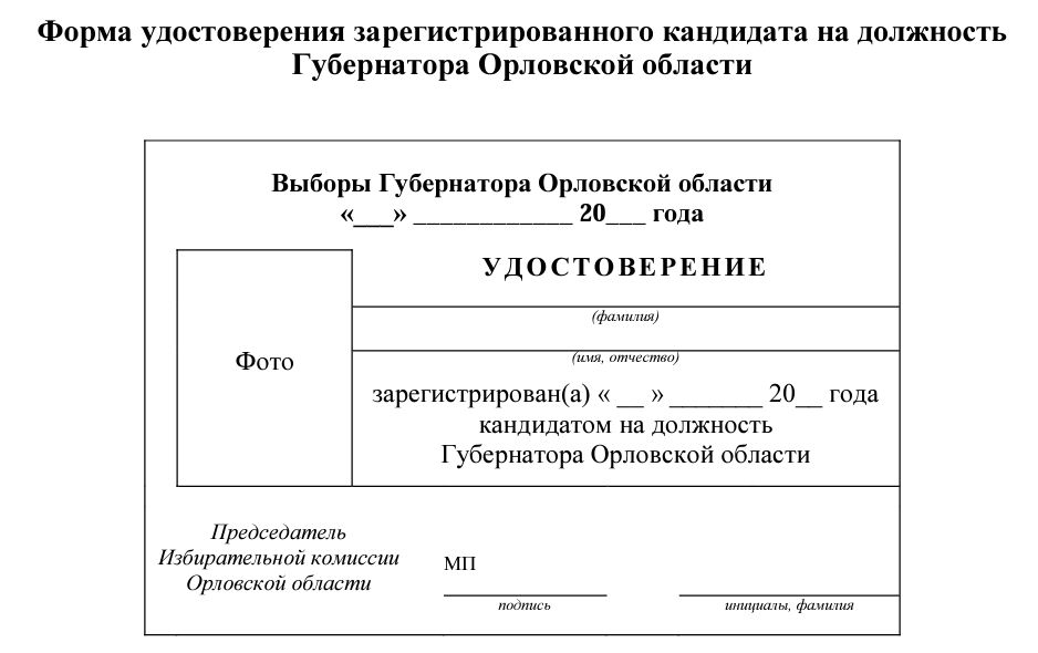 Постановление содержит детальное описание специальных «корочек». Например, для кандидатов в губернаторы удостоверение изготавливается размером 120х80 миллиметров. В нем указываются дата проведения выборов, фамилия, имя, отчество зарегистрированного кандидата, дата регистрации. Помещается фотография зарегистрированного кандидата размером 3х4 сантиметра (при ее предоставлении), ставится подпись председателя Избирательной комиссии Орловской области, а также указываются его инициалы и фамилия.