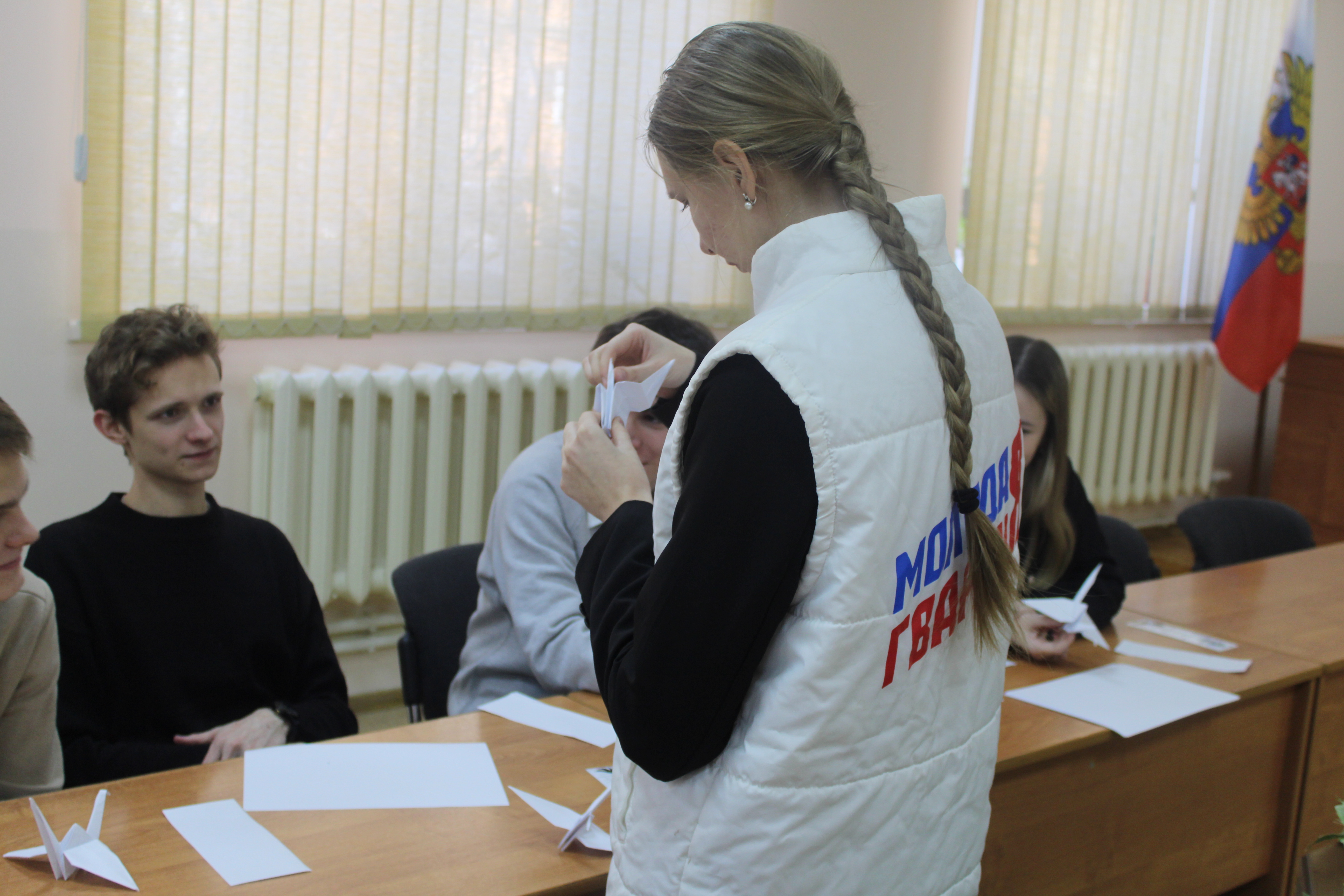 Активисты «Молодой Гвардии» вместе с участниками мастер-класса сделали из бумаги журавлей.