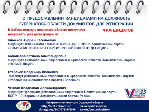 Остальные претенденты все еще включены в предвыборную борьбу. Как сообщили в облизбиркоме, на его 34-м заседании было принято решение о регистрации кандидата на должность губернатора Владислава Числова, выдвинутого Орловским региональным отделением ЛДПР – Либерально-демократической партии России. Кандидату уже вручено удостоверение зарегистрированного кандидата. Кроме того, в облизбирком документы для регистрации представили Андрей Клычков (КПРФ), Светлана Ковалева («Новые люди») и Владимир Стебаков («Российская экологическая партия «Зеленые»).