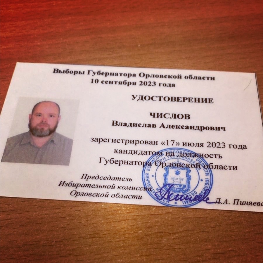 Избирательная комиссия Орловской области выдала документ Владиславу Числову.