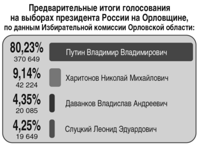 Предварительные итоги на Орловщине отличаются от общероссийских. Как отметила председатель Избирательной комиссии Орловской области Лилия Пиняева, в нашем регионе в голосовании приняли участие 462 025 человек, явка составила 78,8%. За Владимира Путина проголосовало 80,23% избирателей, за Владислава Даванкова – 4,35%, за Леонида Слуцкого – 4,25%, за Николая Харитонова – 9,14%.