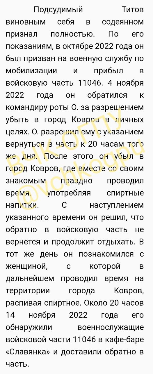 4 ноября уроженец Орловской области обратился к командиру своей части с просьбой отпустить его ненадолго в Ковров в личных целях. Командир согласился, но обязал военнослужащего вернуться в часть к 20:00 часам того же дня. Но ни вечером 4 ноября, ни даже 5-го в часть мобилизованный не вернулся.