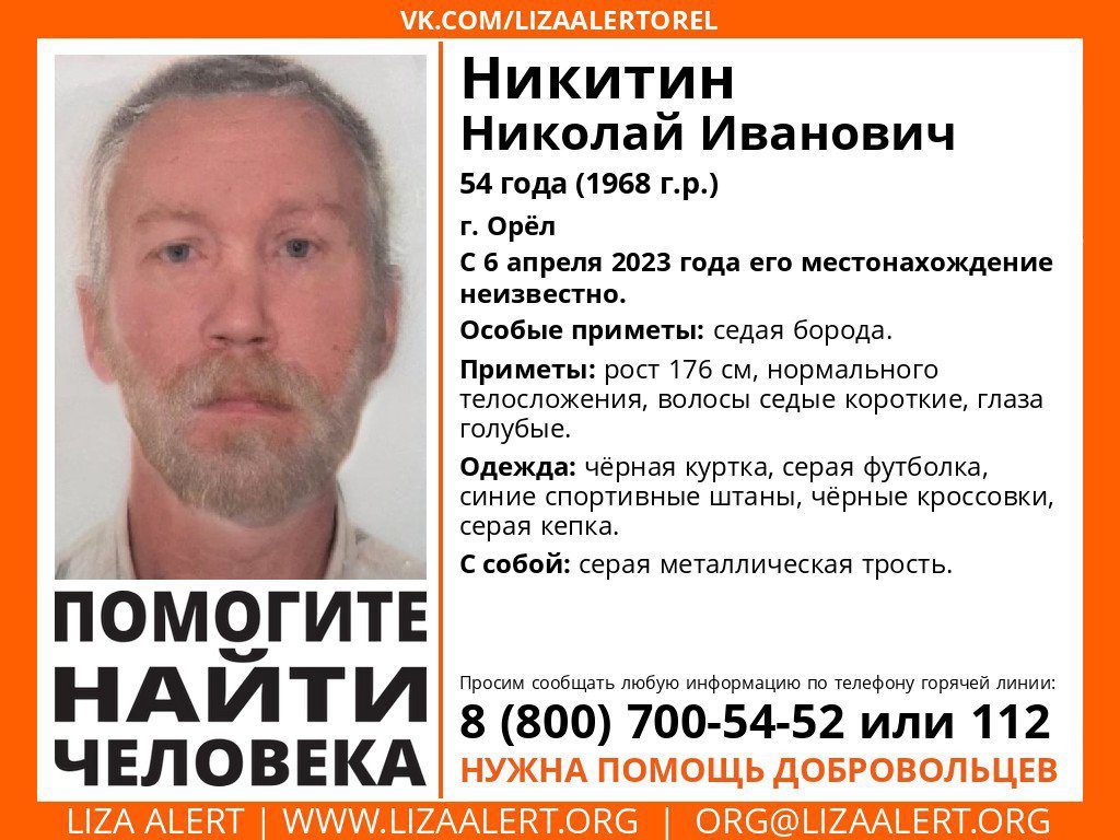 Как сообщают в организации, место нахождения Николая Никитина неизвестно с 6 апреля. Выходя из дома, он был одет в чёрную куртку, серую футболку, синие спортивные штаны, чёрные кроссовки и серую кепку. Также при себе у него имелась трость. В качестве особой приметы поисковики отметили седую бороду.