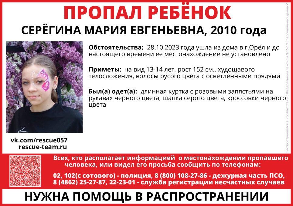 В Орле разыскивается Серёгина Мария Евгеньевна 2010 года рождения. О поисках подростка объявил поисково-спасательный отряд «Сармат».