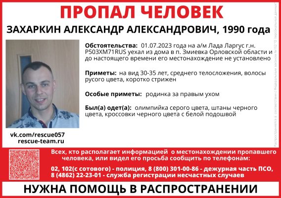 В Орловской области идут поиски Александра Захаркина 1990 года рождения. Мужчина 1 июля на автомобиле LADA Largus (г.н. Р503ХМ71RUS) уехал из дома в посёлке Змиёвка Орловской области и до настоящего времени его местонахождение не установлено. Об этом сообщили в поисково-спасательном отряде «Сармат» в соцсетях.
