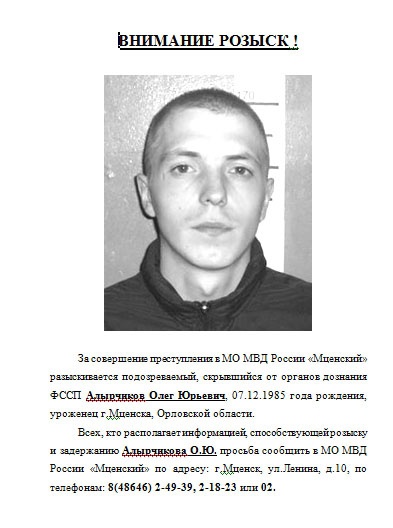 Всех, кто располагает информацией, способствующей розыску и задержанию Алырчикова, просят сообщить в МО МВД РФ «Мценский» по тел.: 8(48646)2-49-39, 2-18-23 или 02.