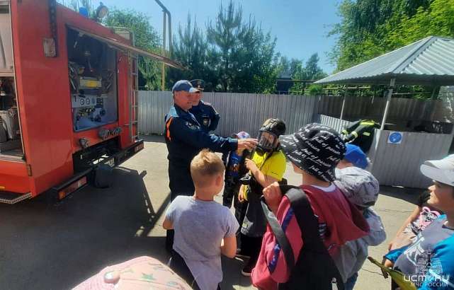 Началась экскурсия с проведения инструктажа по правилам безопасности. Сотрудники рассказали детям о том, как себя вести во время пожара, в быту, на водоемах, в лесу, в городе напомнили, как правильно вызывать пожарных, привели примеры о пожарах, произошедших на территории города и района.