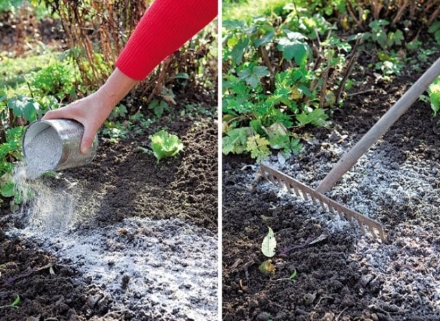 Сухую известь рассыпают равномерным слоем по поверхности земли. Затем перекапывают почву на глубину около 20 см.