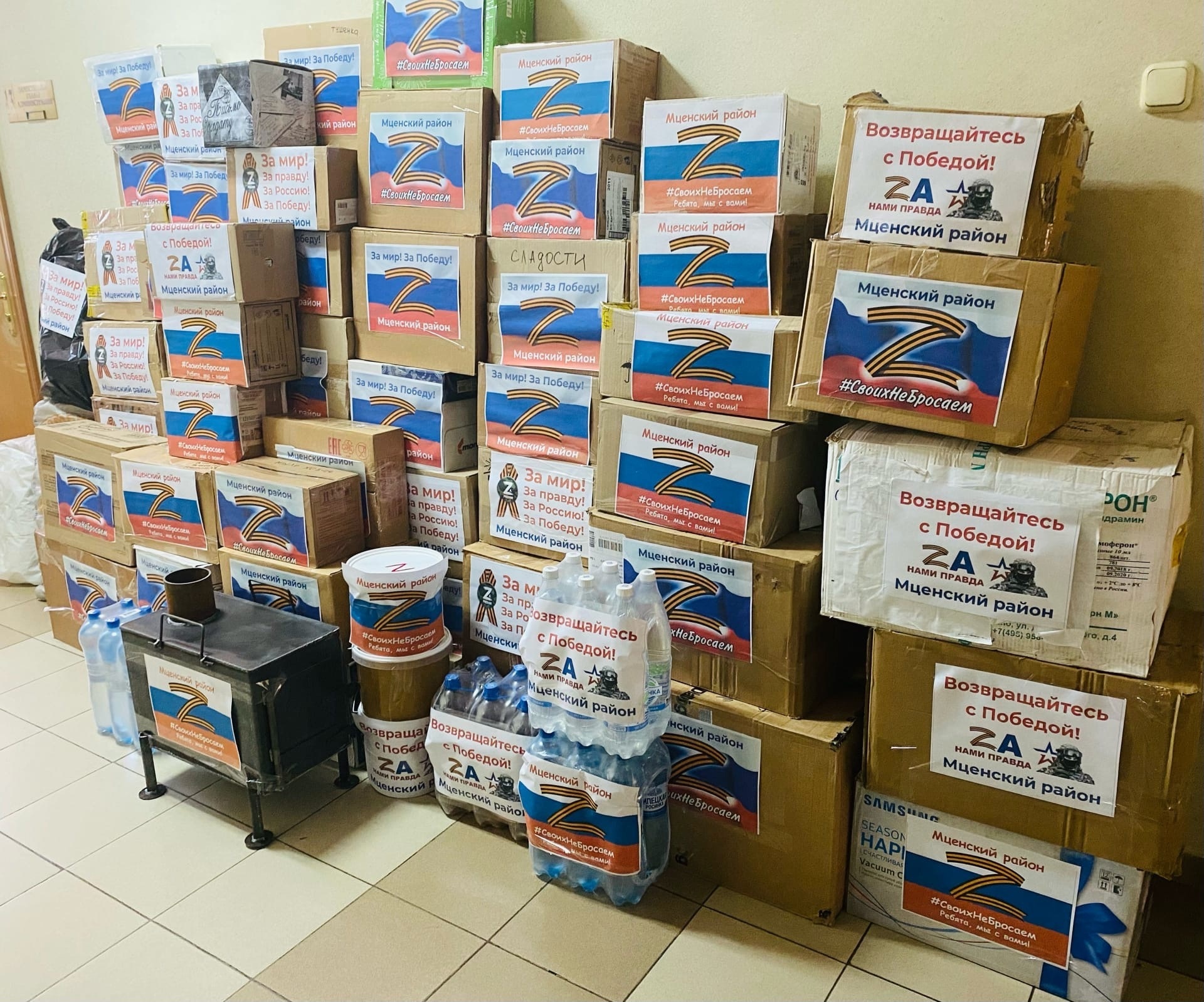В сбор гуманитарной помощи для наших защитников свой вклад внесли АО «Мценский Завод «Коммаш», изготовивший походные печи, АО «Центральная ППК» ст.Орел, ИП Сапожникова Н. Н., Глазуновская, Краснооктябрьская, Аникановская, Отрадинская и Протасовская школы района, Мценская районная библиотека им. И. С. Тургенева, а также неравнодушные жители Мценского района и города Мценска. Также ребятам будут доставлены посылки от родных. Школьники передали бойцам письма с теплыми пожеланиями и словами поддержки.