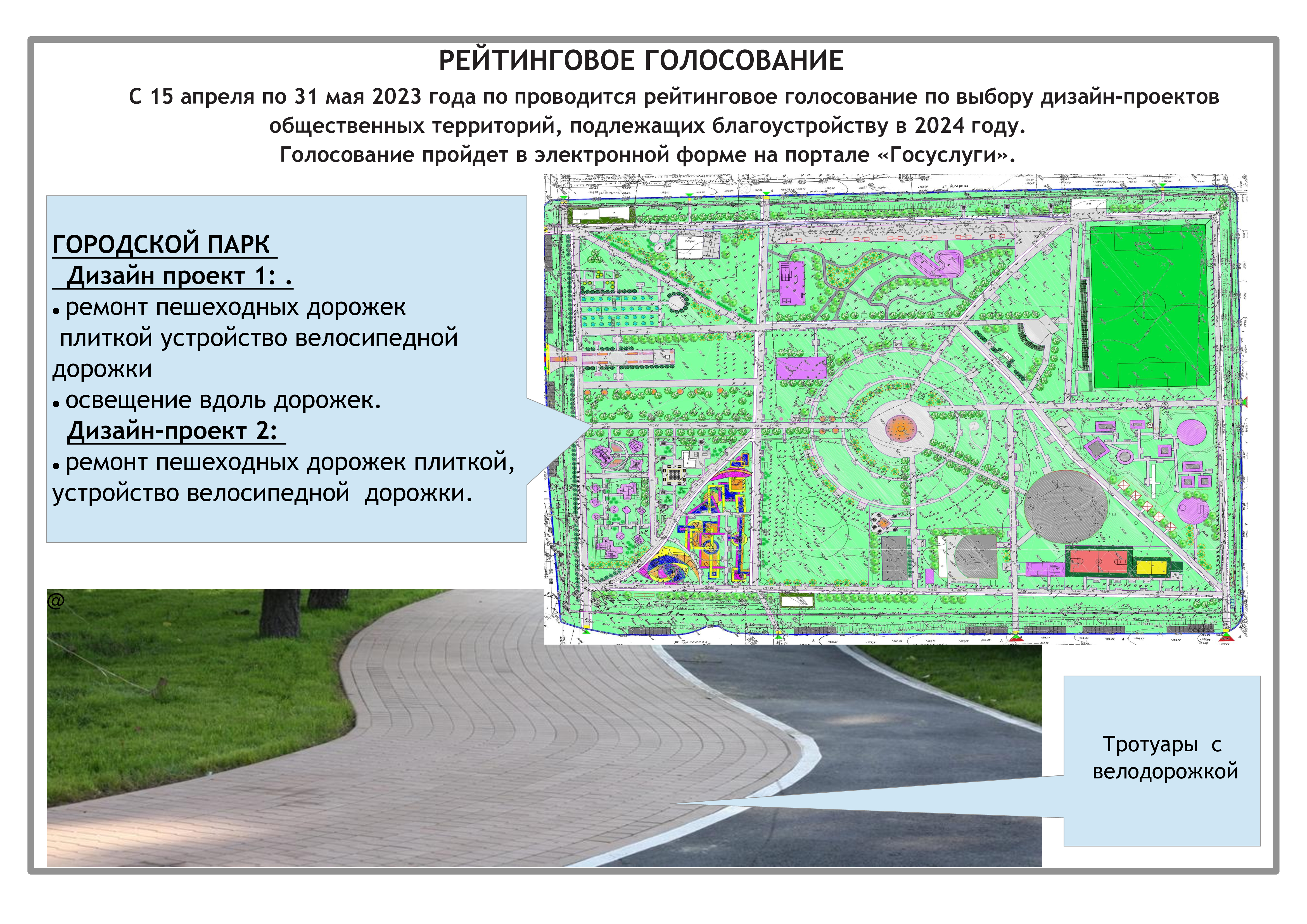Д изайн-проект 1. Ремонт пешеходной дорожки : планируется провести ремонт пешеходной дорожки плиткой, устройство велосипедной дорожки, установку освещения вдоль дорожки.