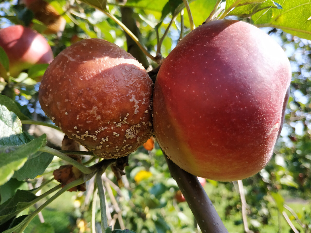 Инфекция проникает в плод через повреждения на кожице. Также источником болезни являются оставленные на дереве пораженные плоды и засохшие от монилиоза веточки, которые не были удалены при санитарной обрезке. Первые признаки заболевания проявляются при обнаружении червивой падалицы. При этом летние сорта яблонь страдают от заболевания раньше, зимние – позже. По мере созревания урожая количество пораженных плодов растет. Если гнилое яблоко остается висеть на дереве, то по плодоножке грибок проникает в плодовую веточку, плодушку и поражает близлежащие побеги.
